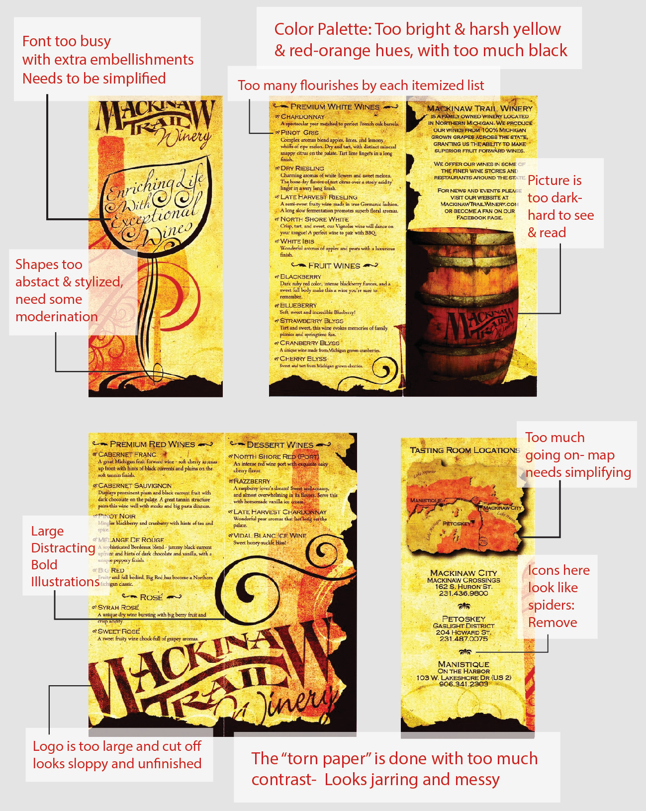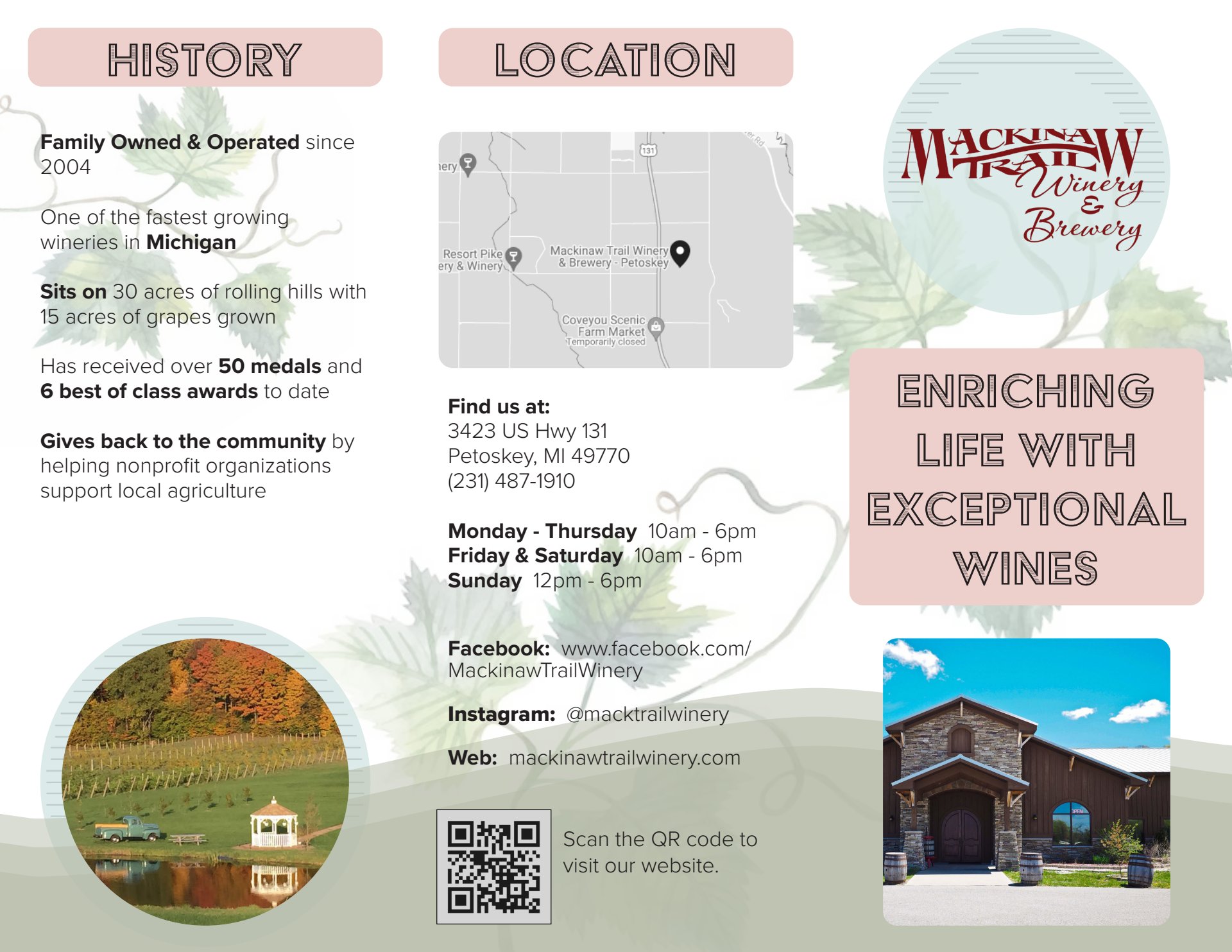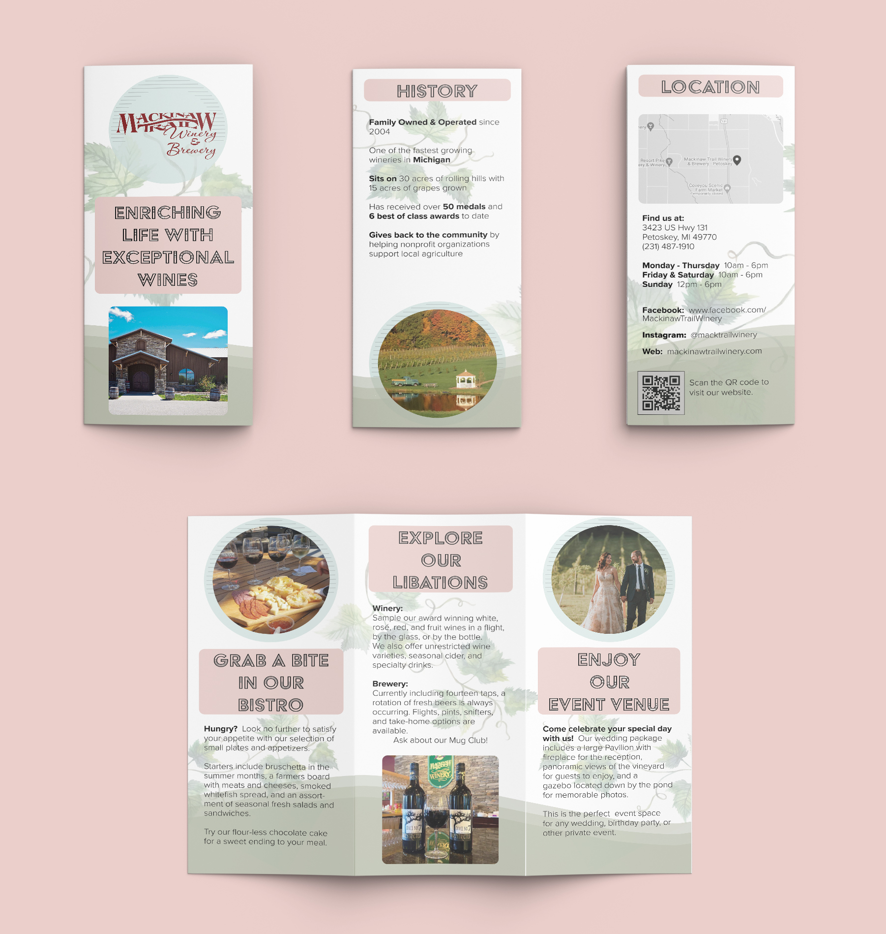 For this 2023 brochure redesign project, I chose the Mackinaw Trail Winery & Brewery, located in Northern Michigan in the Petoskey area. The targeted audience is adults of legal drinking age who enjoy visiting where the wine is made and receiving expert advice on the complexities of wine and beer that Mackinaw Trail is known for. Therefore, the brochure emphasizes their award-winning selections and conveys a sophisticated and upscale experience to entice visitors to come back year after year.