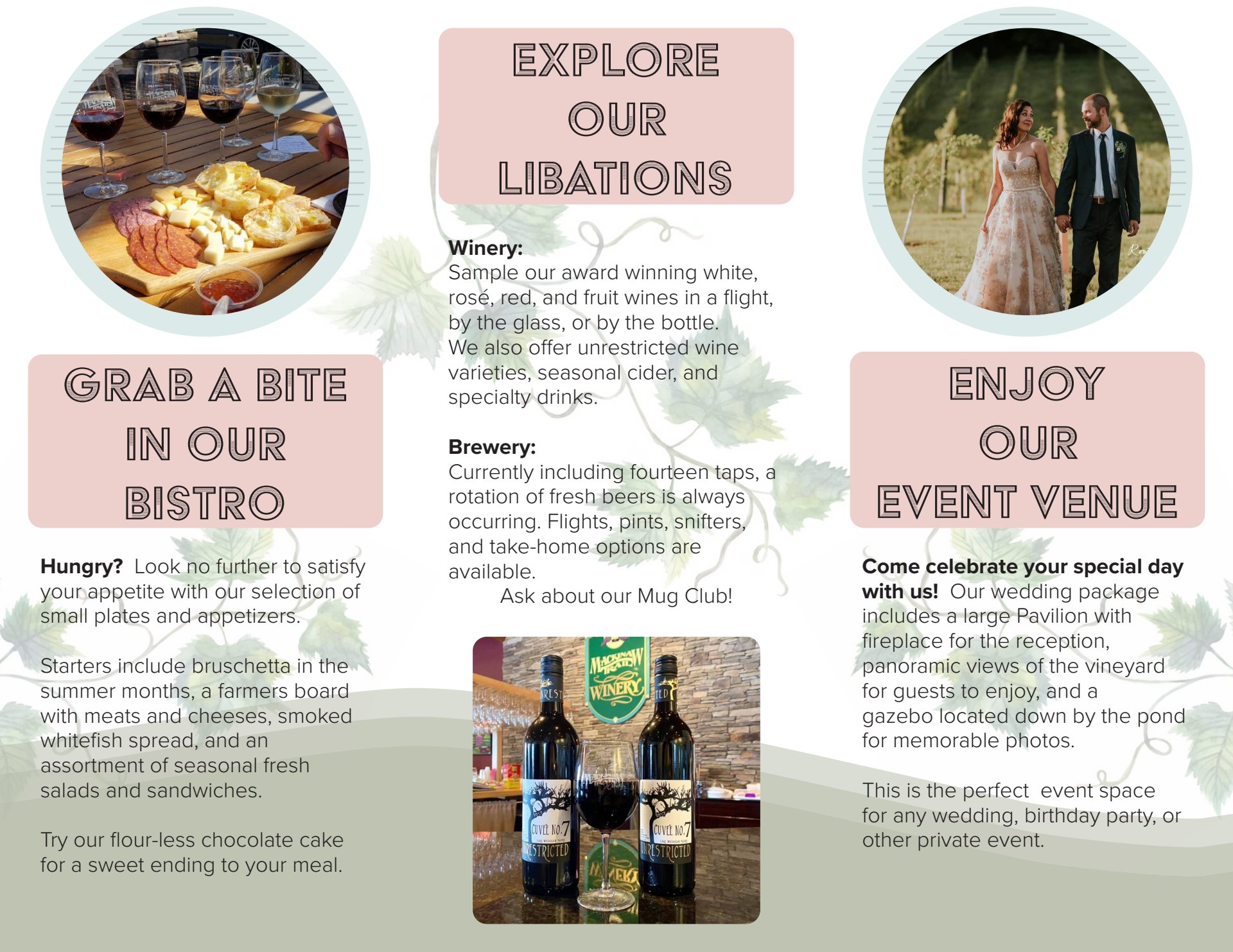 Key information in the new brochure is their winery, brewery, bistro, and wedding/event venues available. This includes all the Winery has to offer in a quick and easy-to-read brochure that is aesthetically pleasing to look at- And now rivals the looks of competing local wineries. The brochure also includes their location, contact information, hours, social media info, and a QR code for easy access to their website.