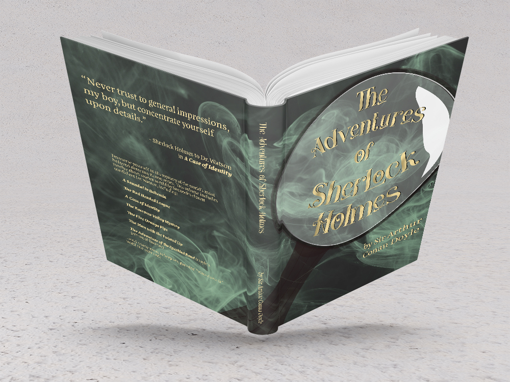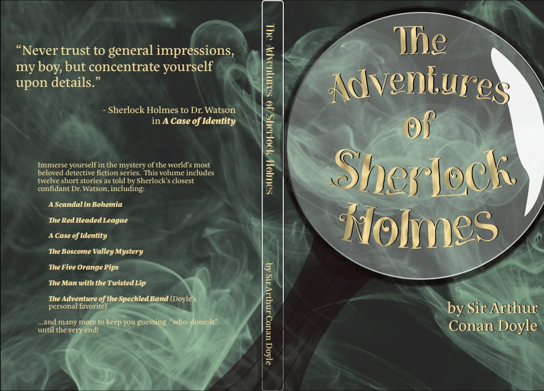For this classic book cover redesign- I chose The Adventures of Sherlock Holmes because who doesn’t love a classic mystery novel? My aim was to keep a close color palette of a moody green along with a modernized elaborate antique style typeface. I incorporated the magnifying glass into the design to showcase the title, and added the smoky background to add to the mysterious aura of the novel.