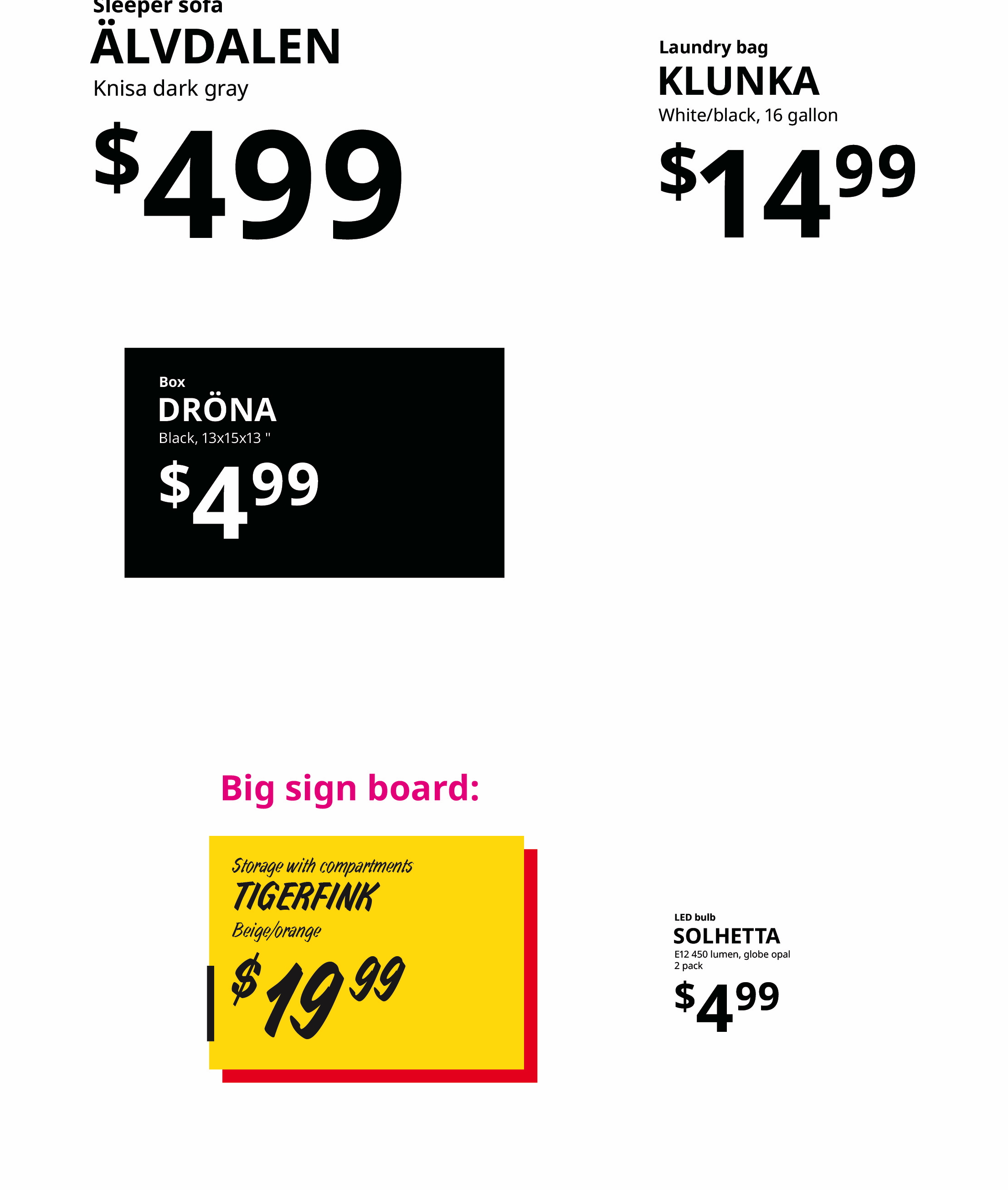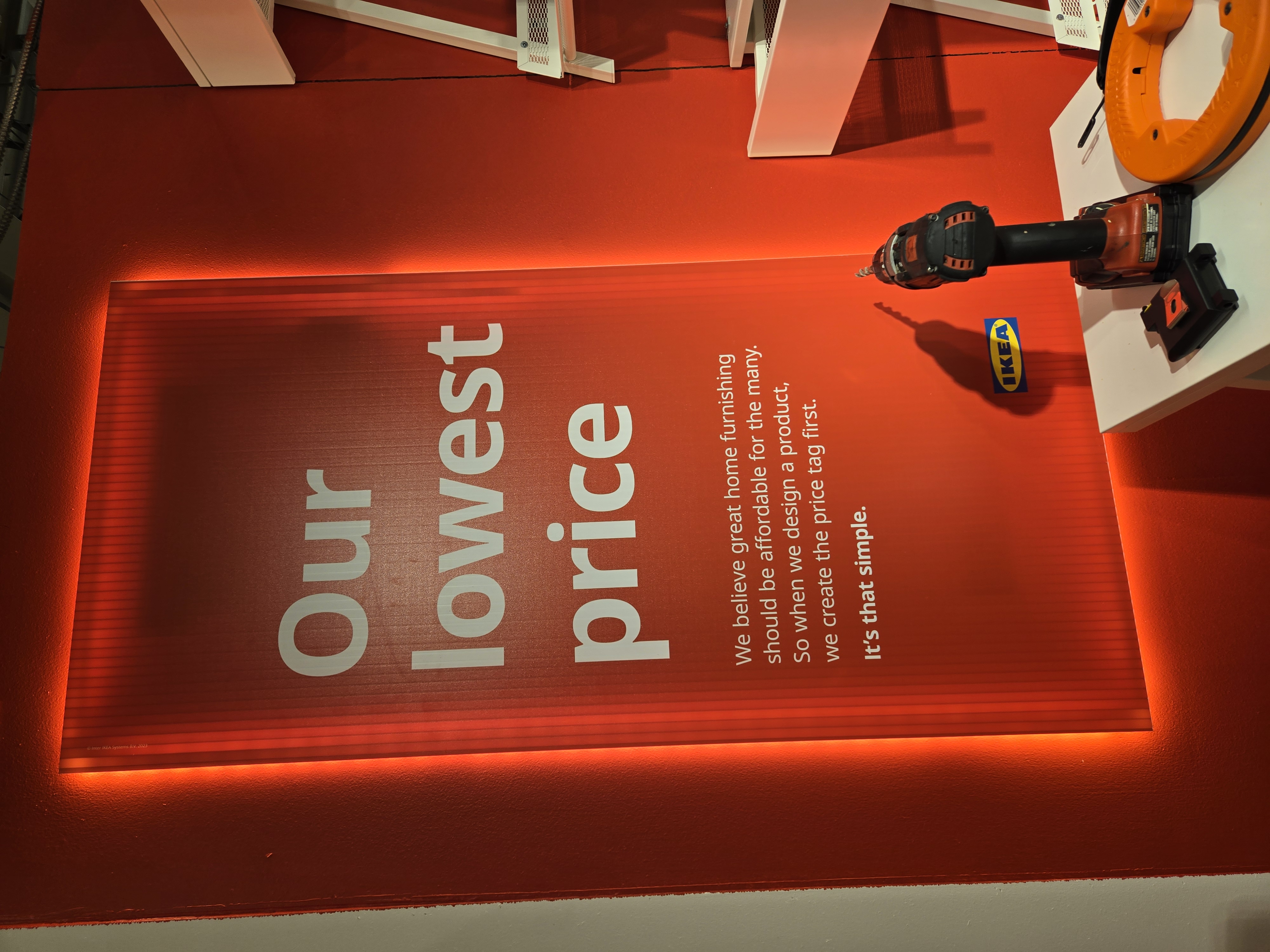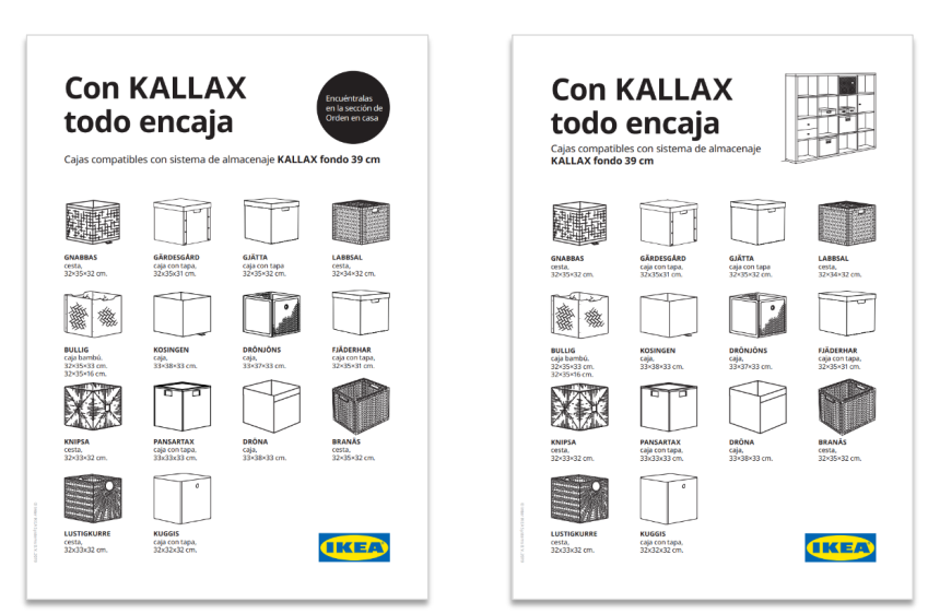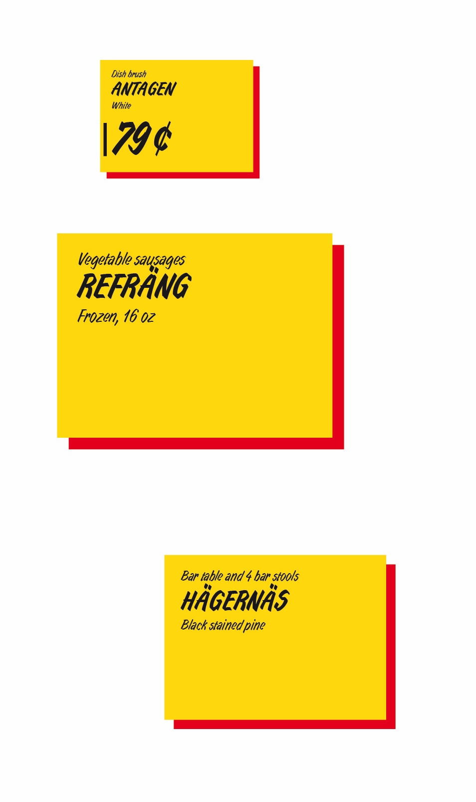 IKEA highlights Breath-Taking Items with their own special graphic requirements (called a tactical box); These are created by printing the yellow box, cutting, and laminating it- The price is printed and applied later, which enables easy changes.