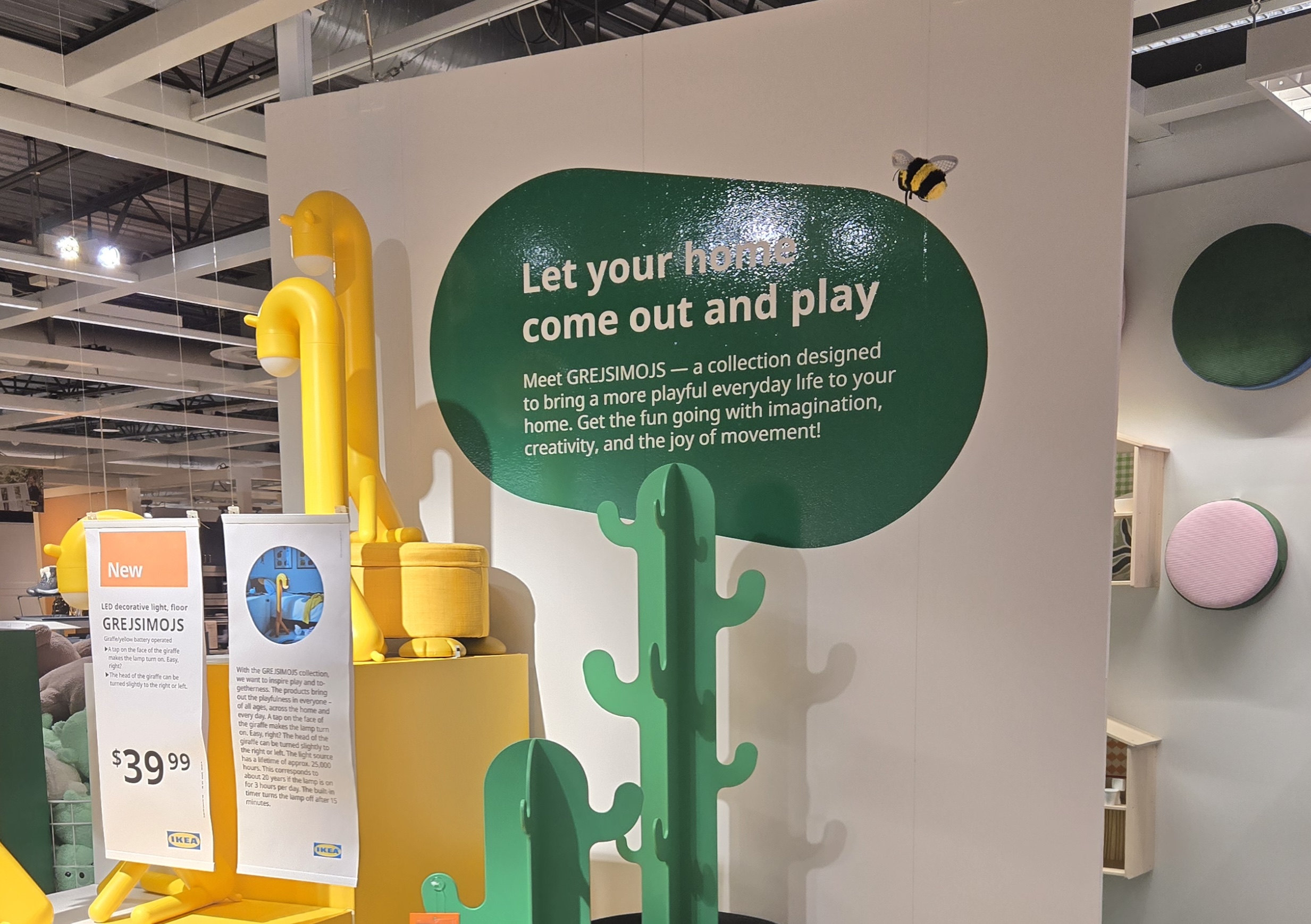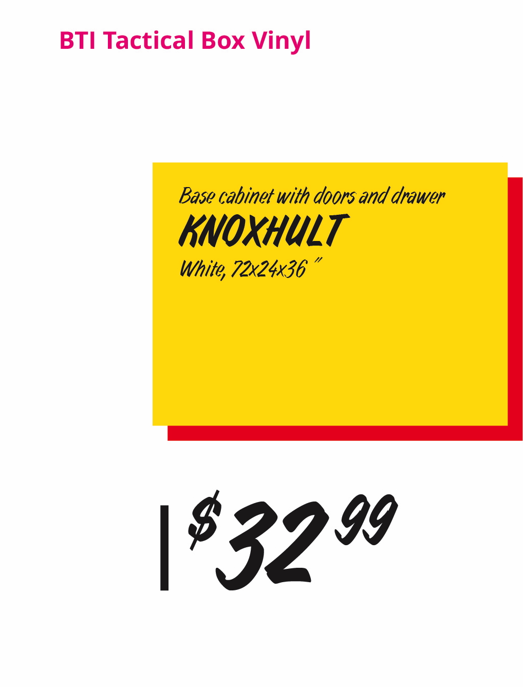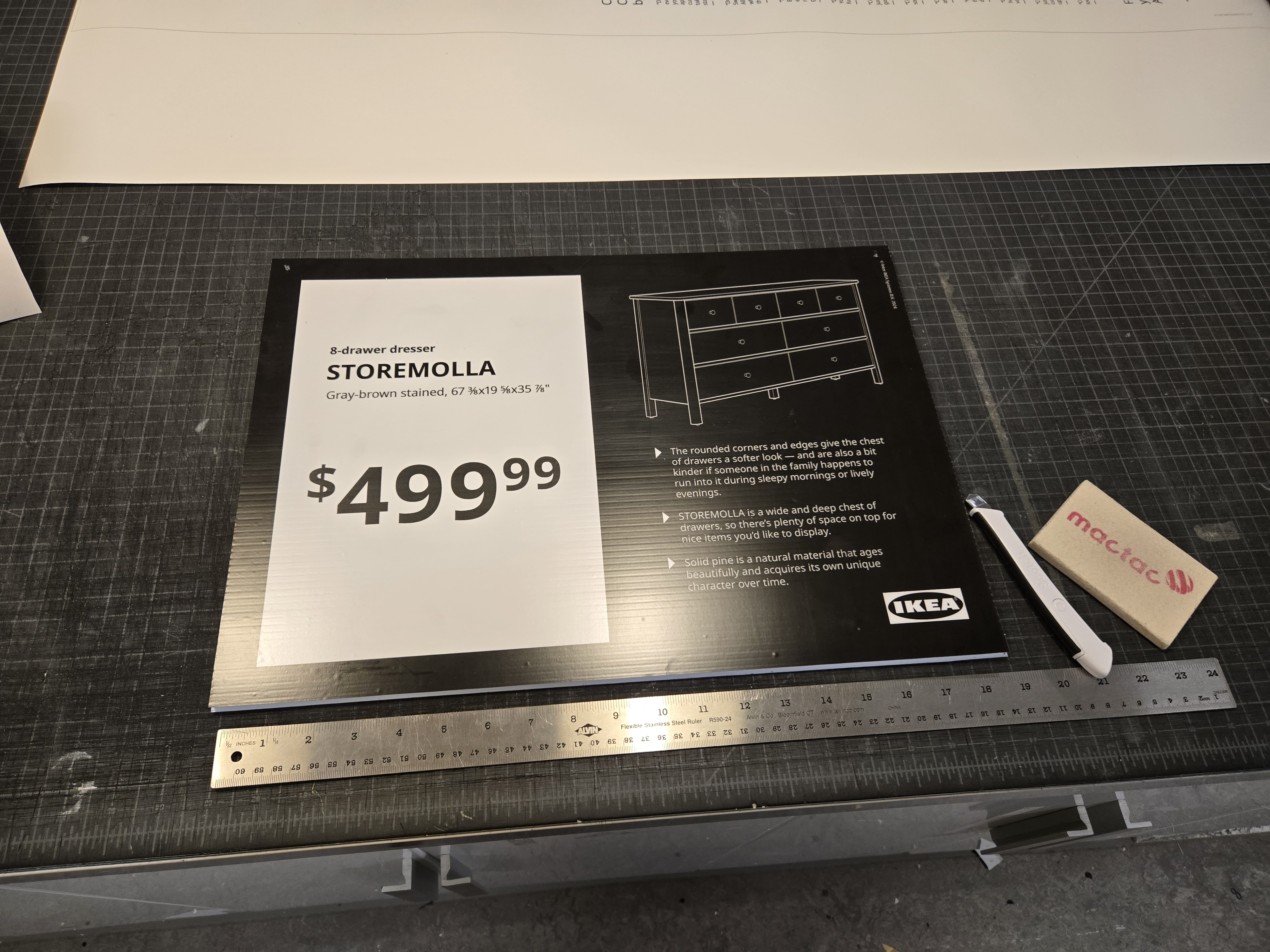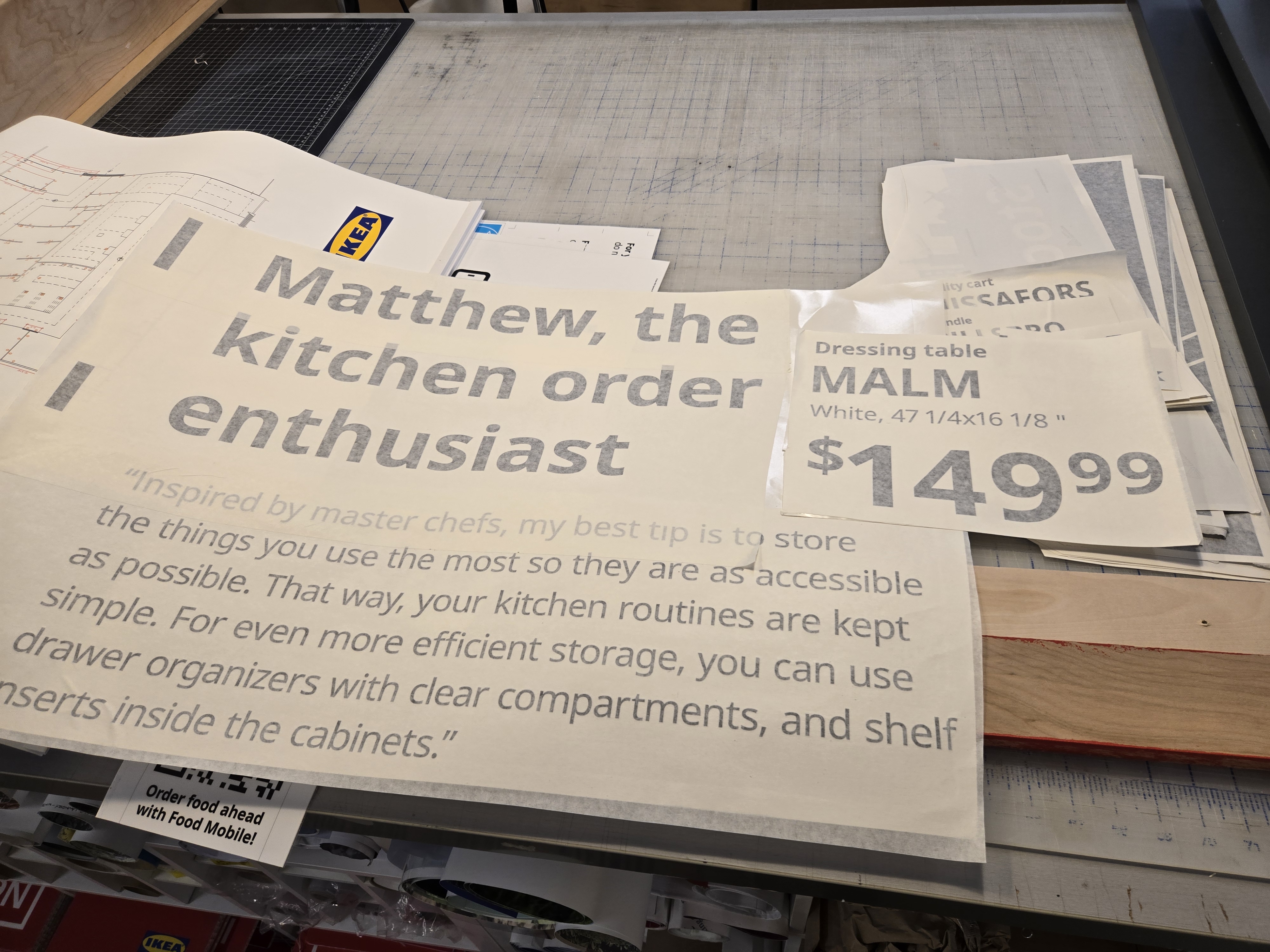 IKEA highlights Breath-Taking Items with their own special graphic requirements (called a tactical box); These are created by printing the yellow box, cutting, and laminating it- The price is printed and applied later, which enables easy changes.