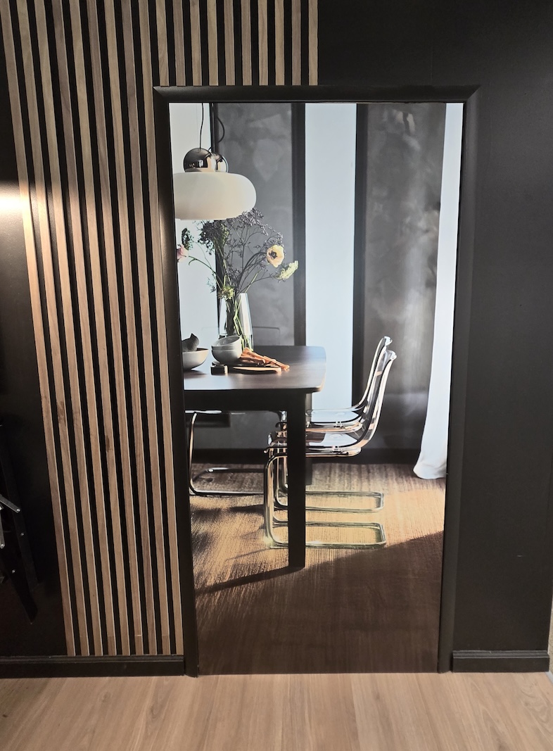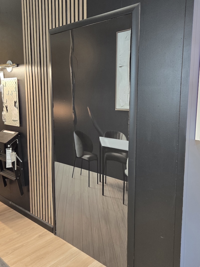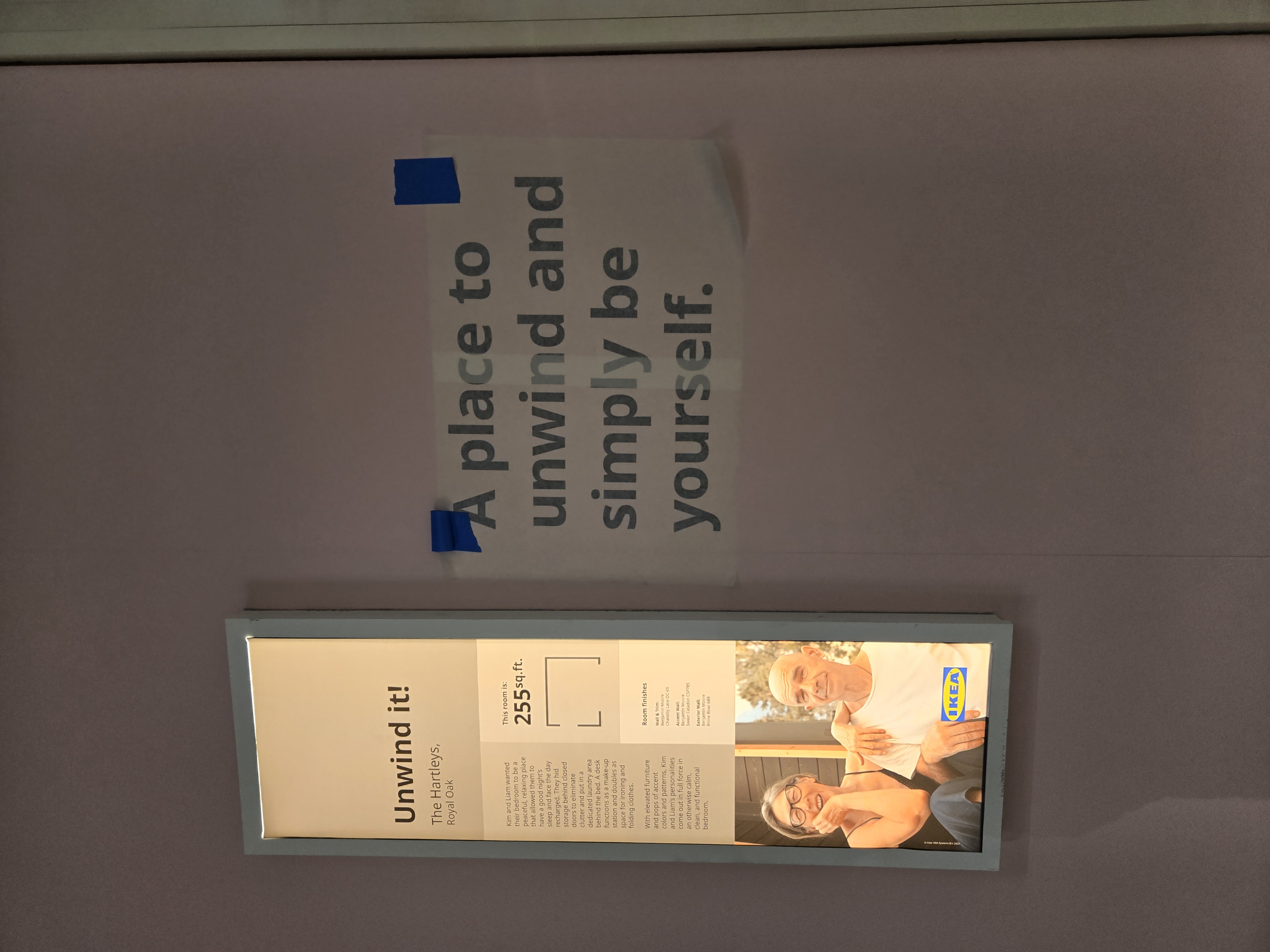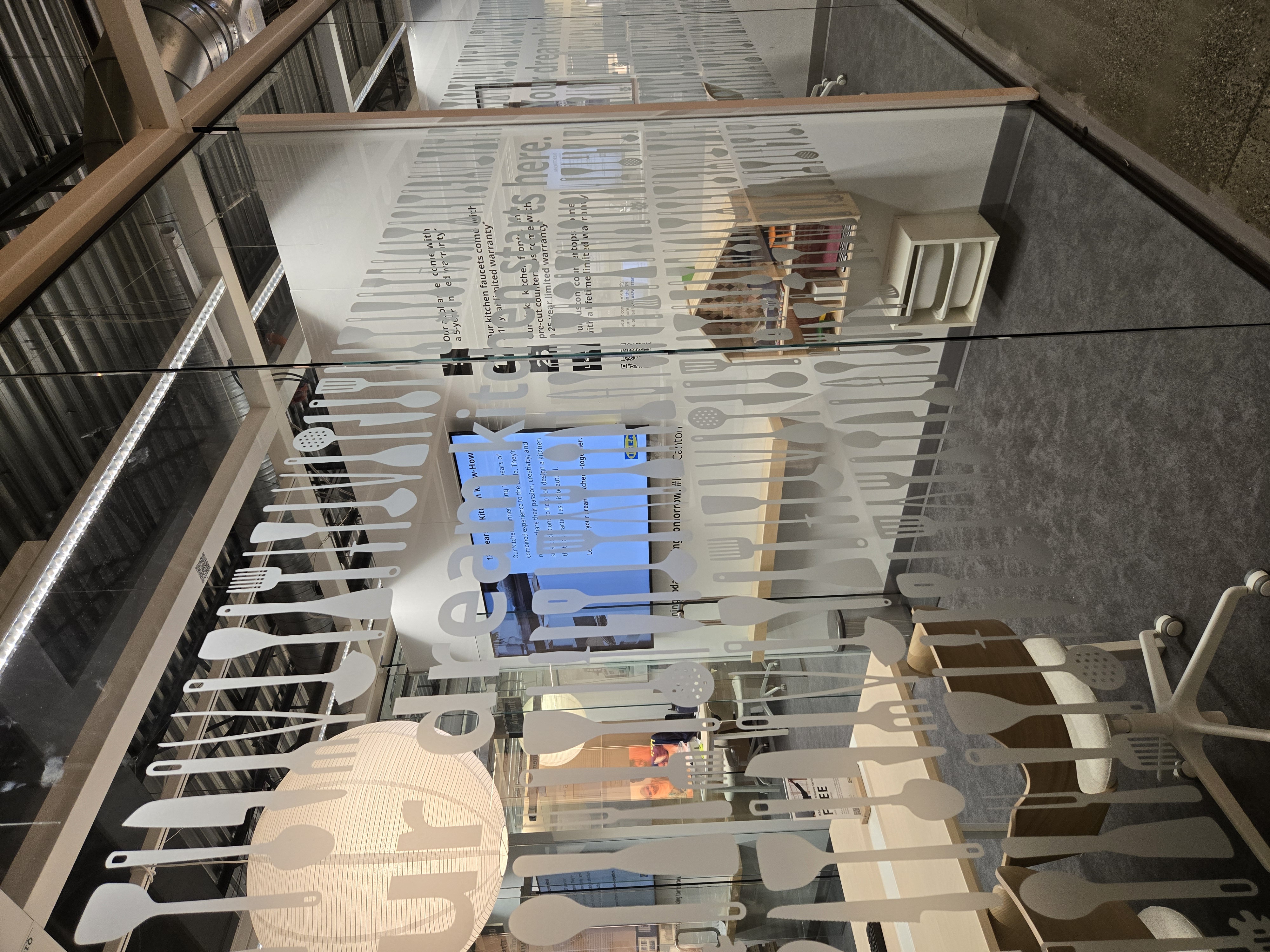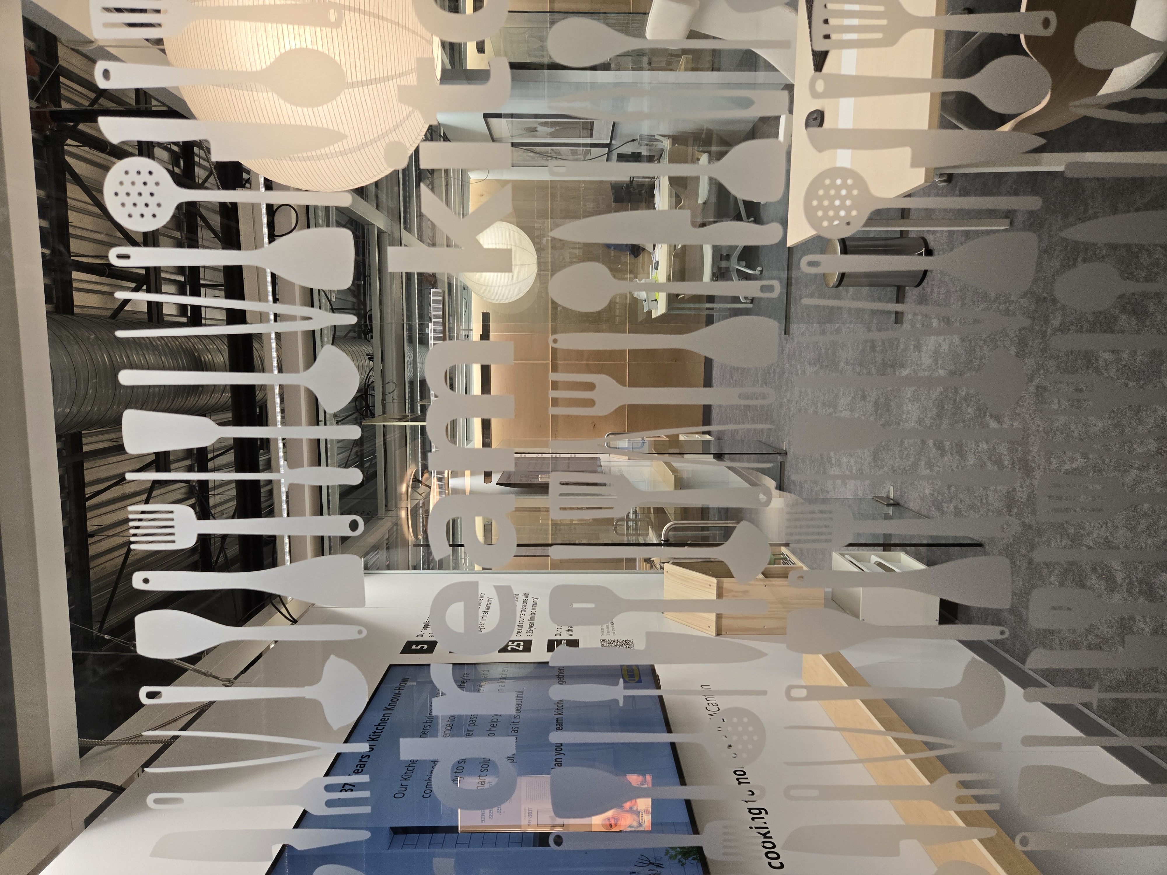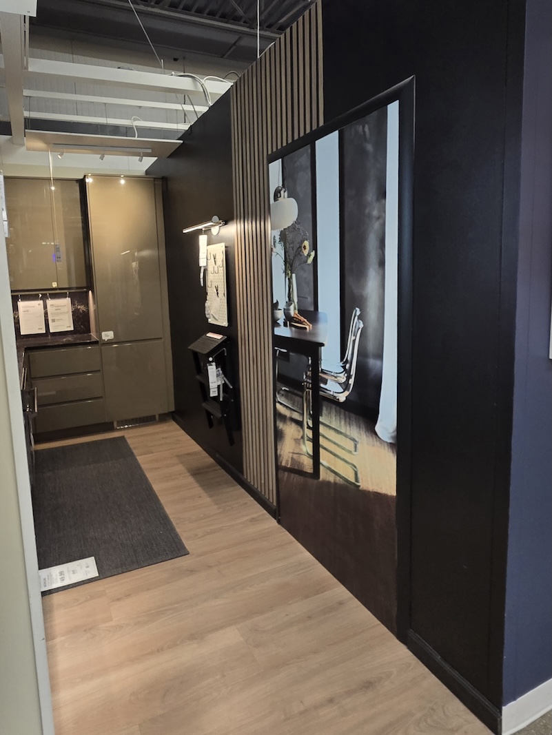 Sometimes a kitchen display is too small to display a door, and rather a doorway into another room is needed – That’s where the Graphics team comes in. The current vinyl has suffered some damage and needed to be removed and replaced; But I wanted to create a more engaging image and use IKEA furniture instead of the stock Adobe image that was there previously. Using Photoshop I elongated the perfect image from the IKEA asset database to fit into the 36" x 80" opening, What an improvement!
