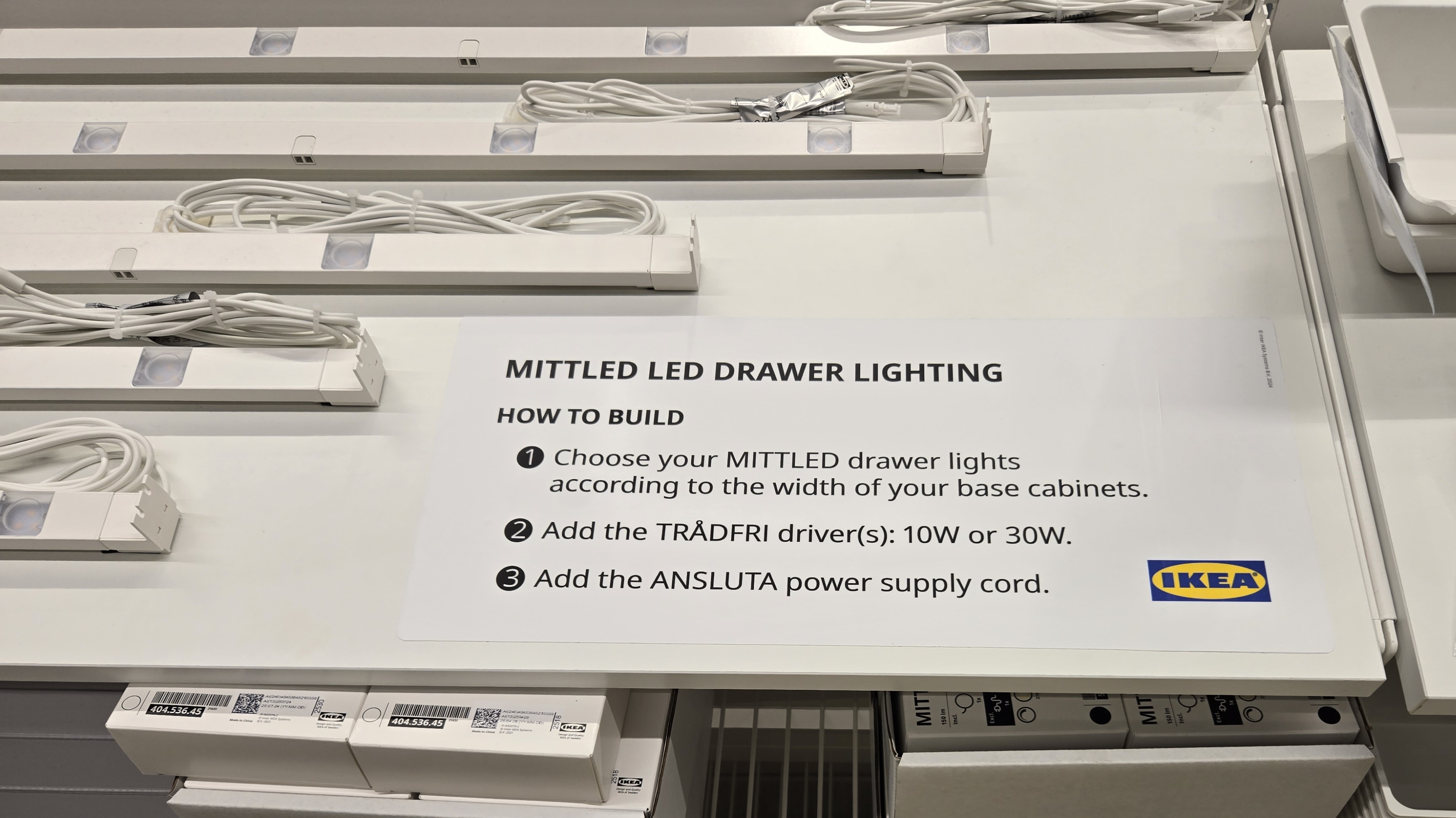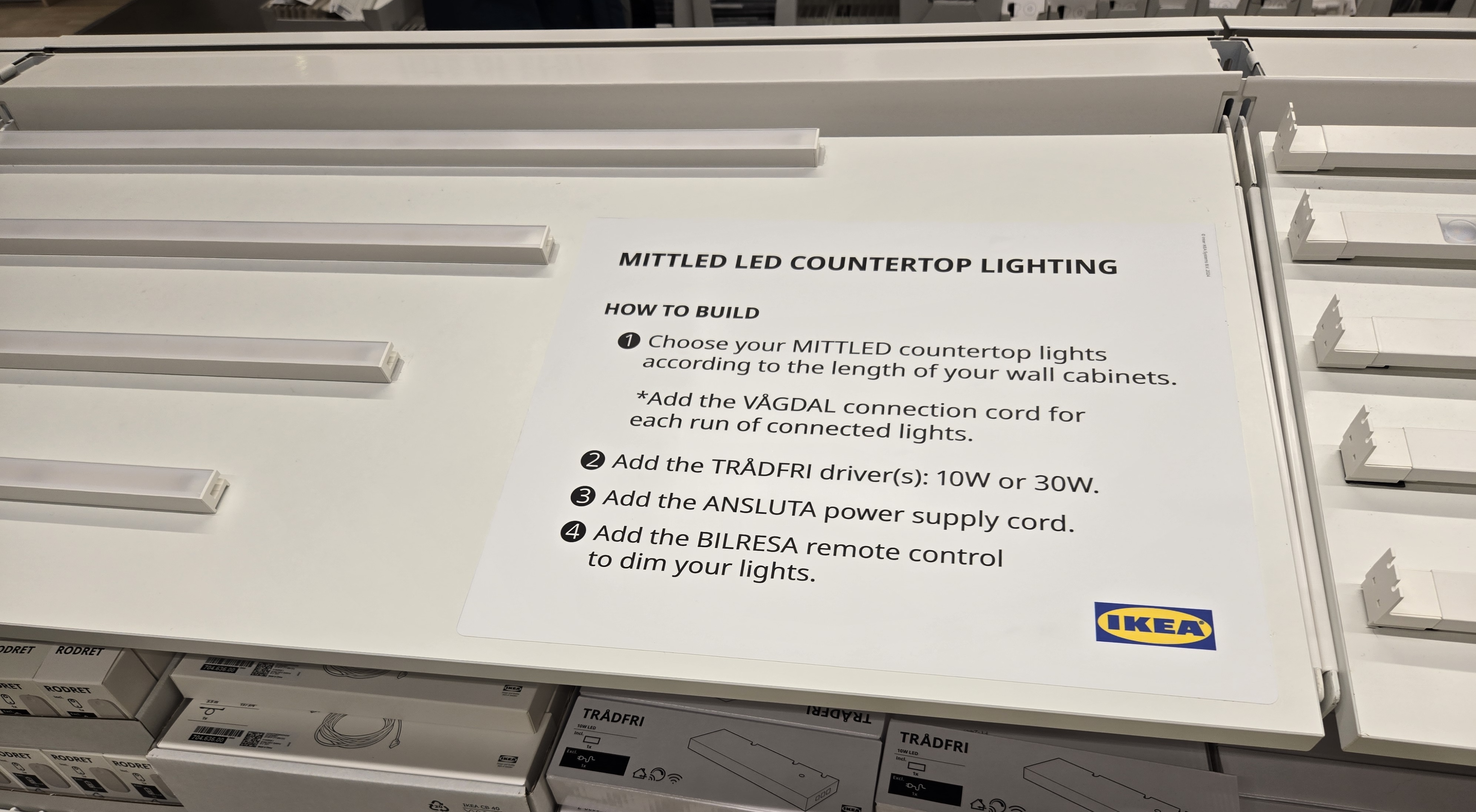 Our Com-In partner needed signage for both countertop and drawer lighting next to the displays that described all the parts needed to complete the product. Referencing the Integrated kitchen lighting buying guide and “How To Build” steps, I condensed them for clarity and simplicity based on my knowledge of the buying process in my sales role. They were printed and laminated on vinyl sized to fit on the display shelves.