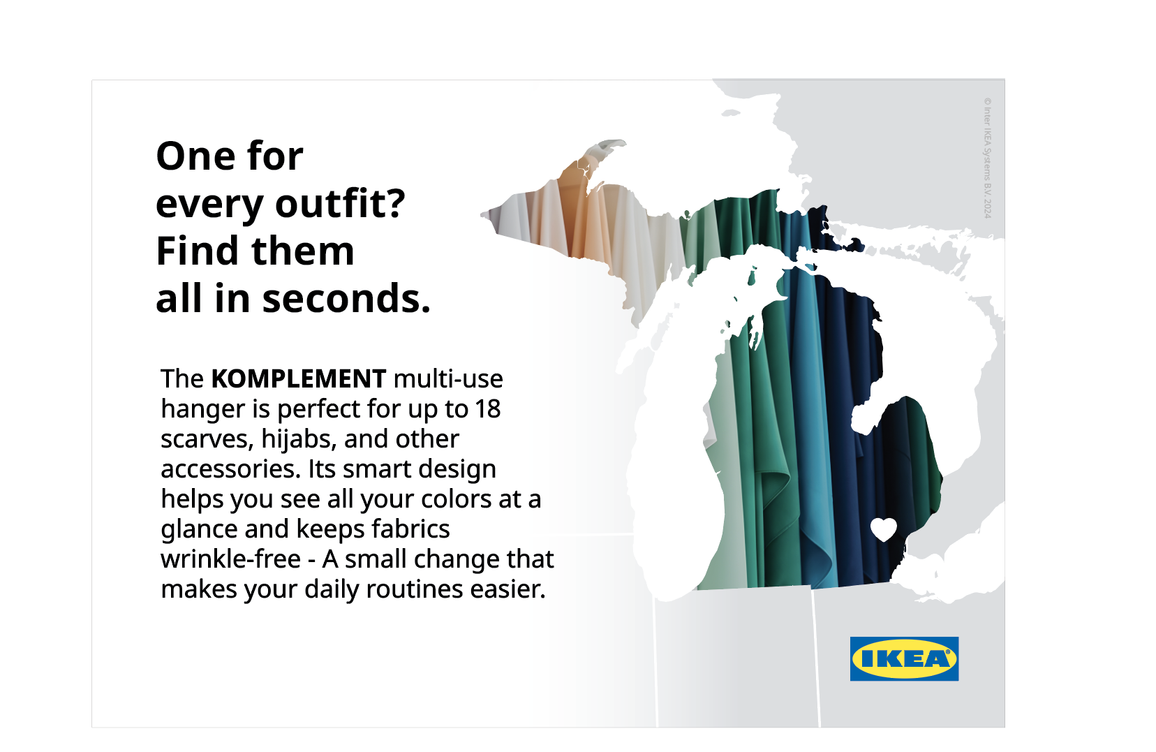 For this request, a sign highlighting the KOMPLEMENT multi-use hanger for storing scarves and hijabs was perfect for our local muslim community. I created the title based off of the IKEA voice (curious, humble, honest, clear, playful, confident, & optimistic) and sourced an image of colorful scarves from Adobe Stock because the colors reminded me of water- and Michigan is the Great Lake State.